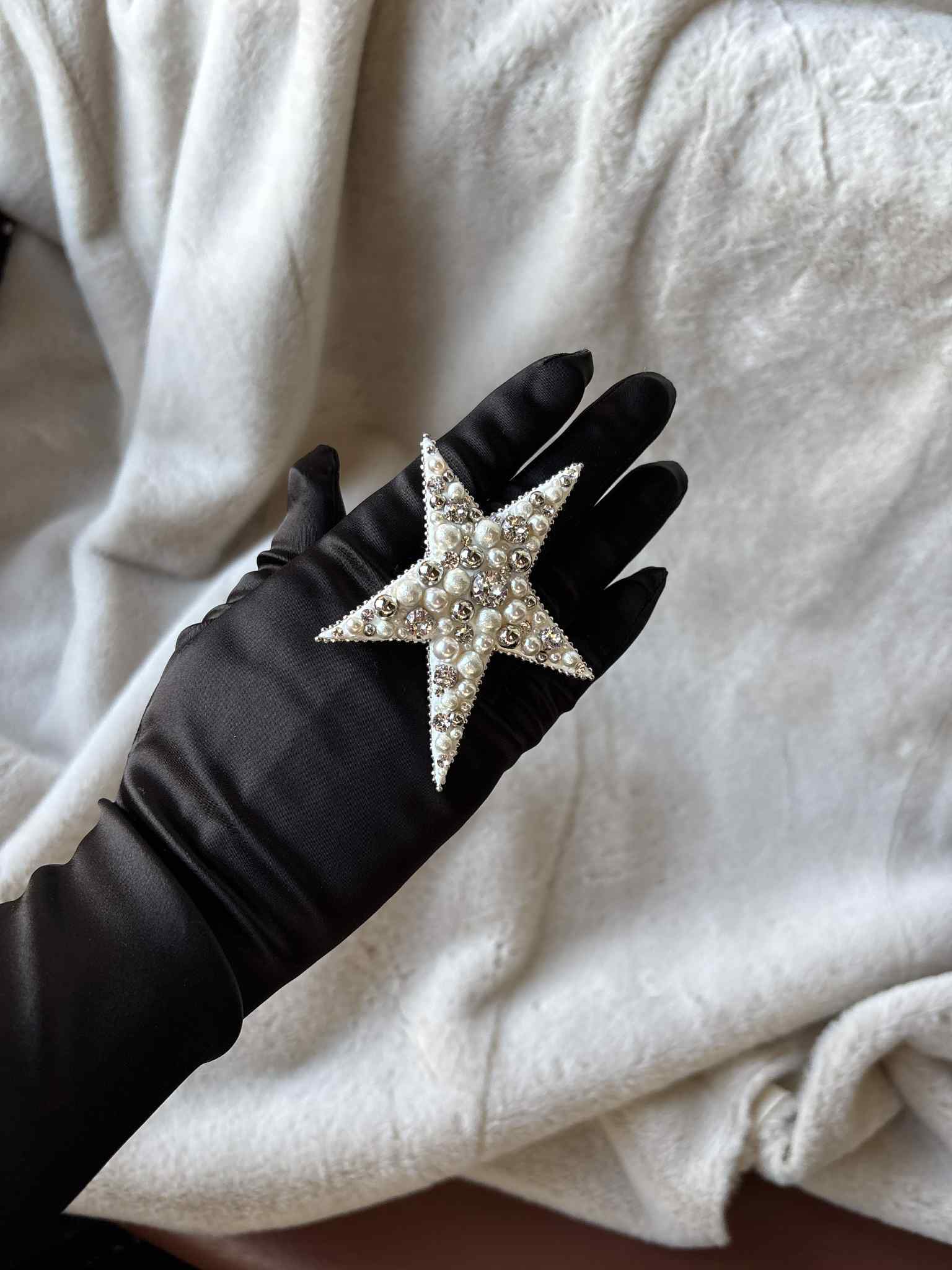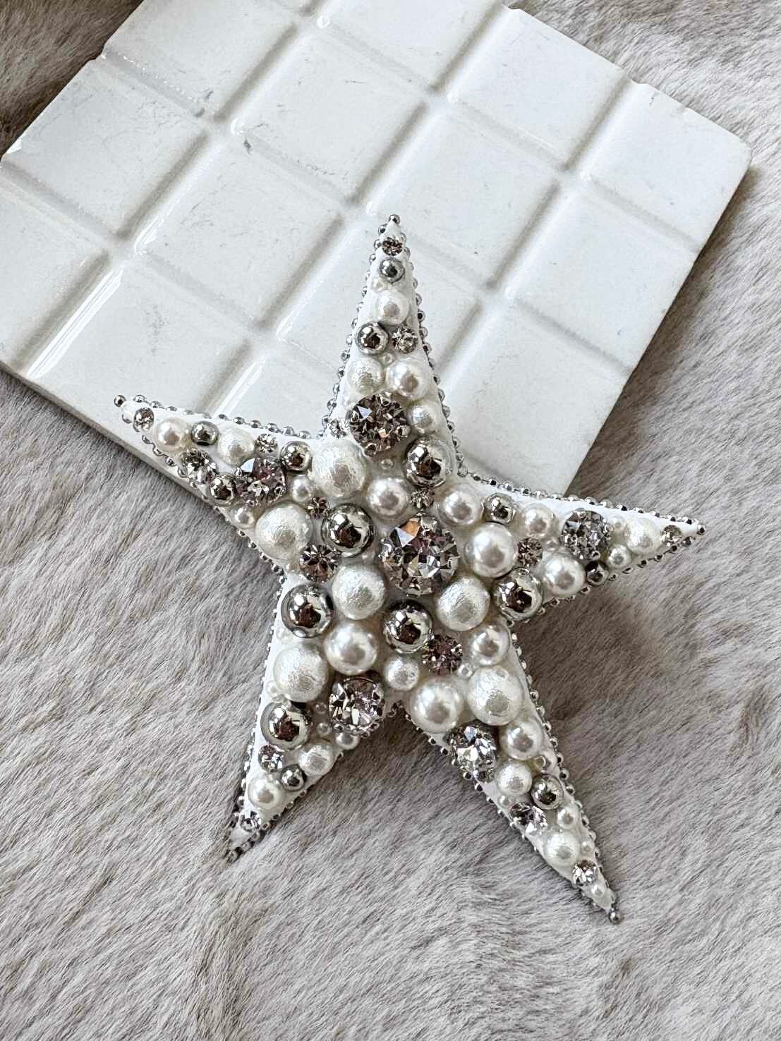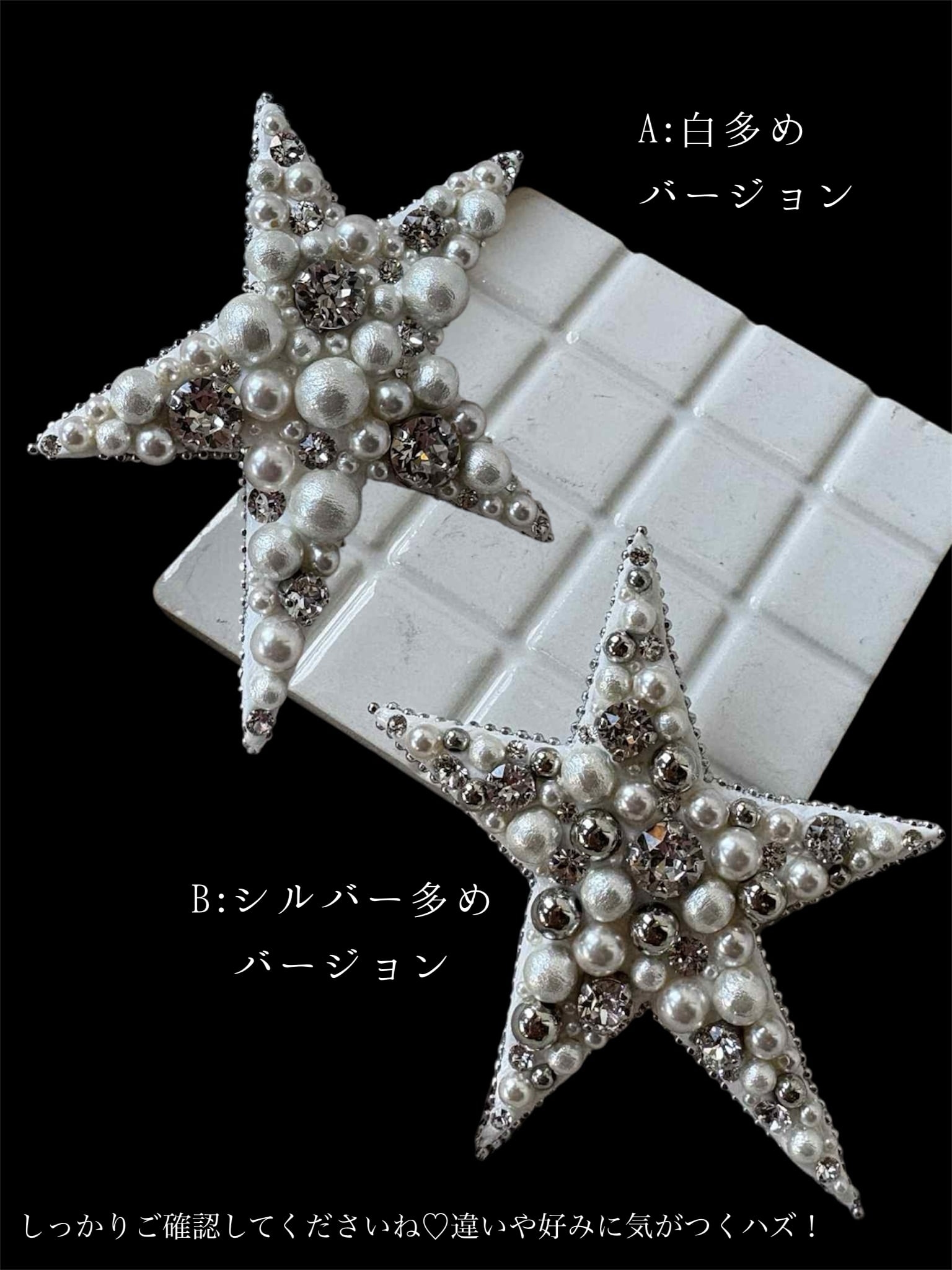 華やかな白をベースに、さまざまな大きさのパールとシルバーのビーズを贅沢にデザインした一品。グルーデコによる1点ずつのハンドメイド。